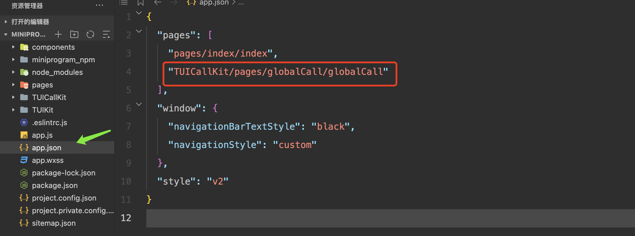 在 pages/index/index.json 中引入 TUIKit 组件,如图所示: