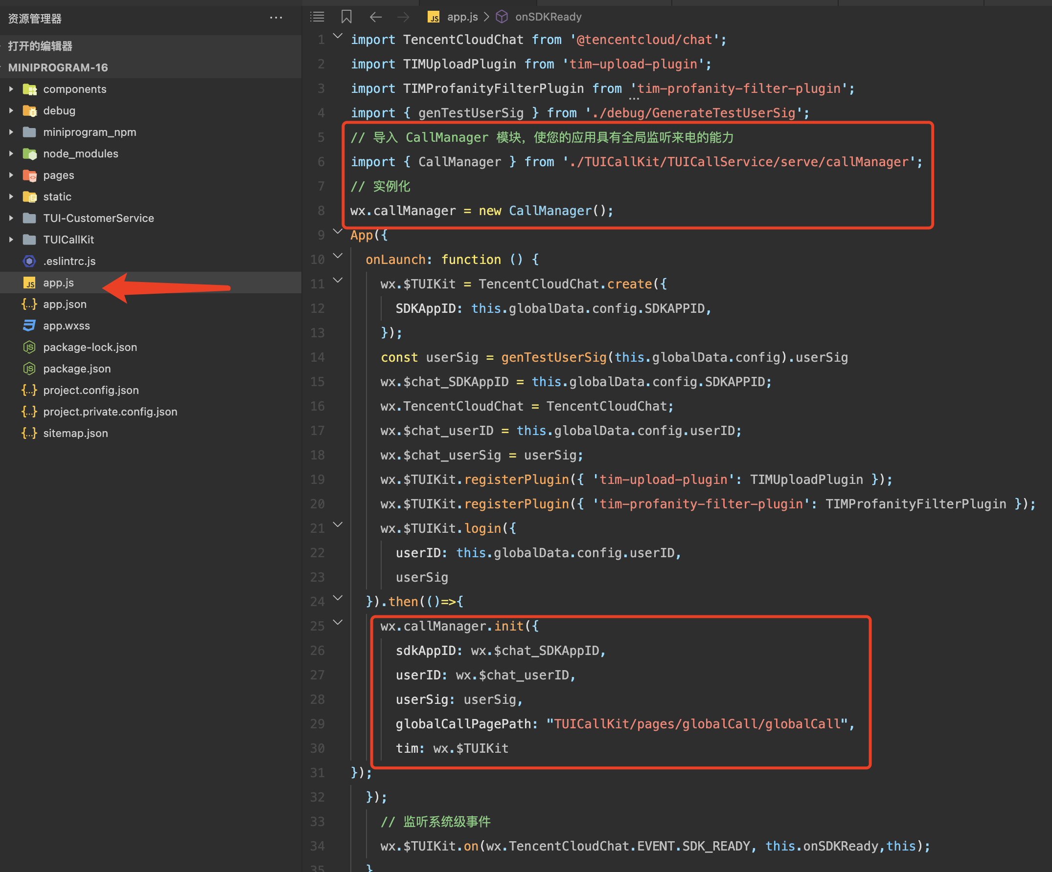 2. 将 TUIKit 文件夹下的 debug 文件夹复制到主包,并在 app.js 初始化 chat 和设置 TUIKit 参数,如图所示: