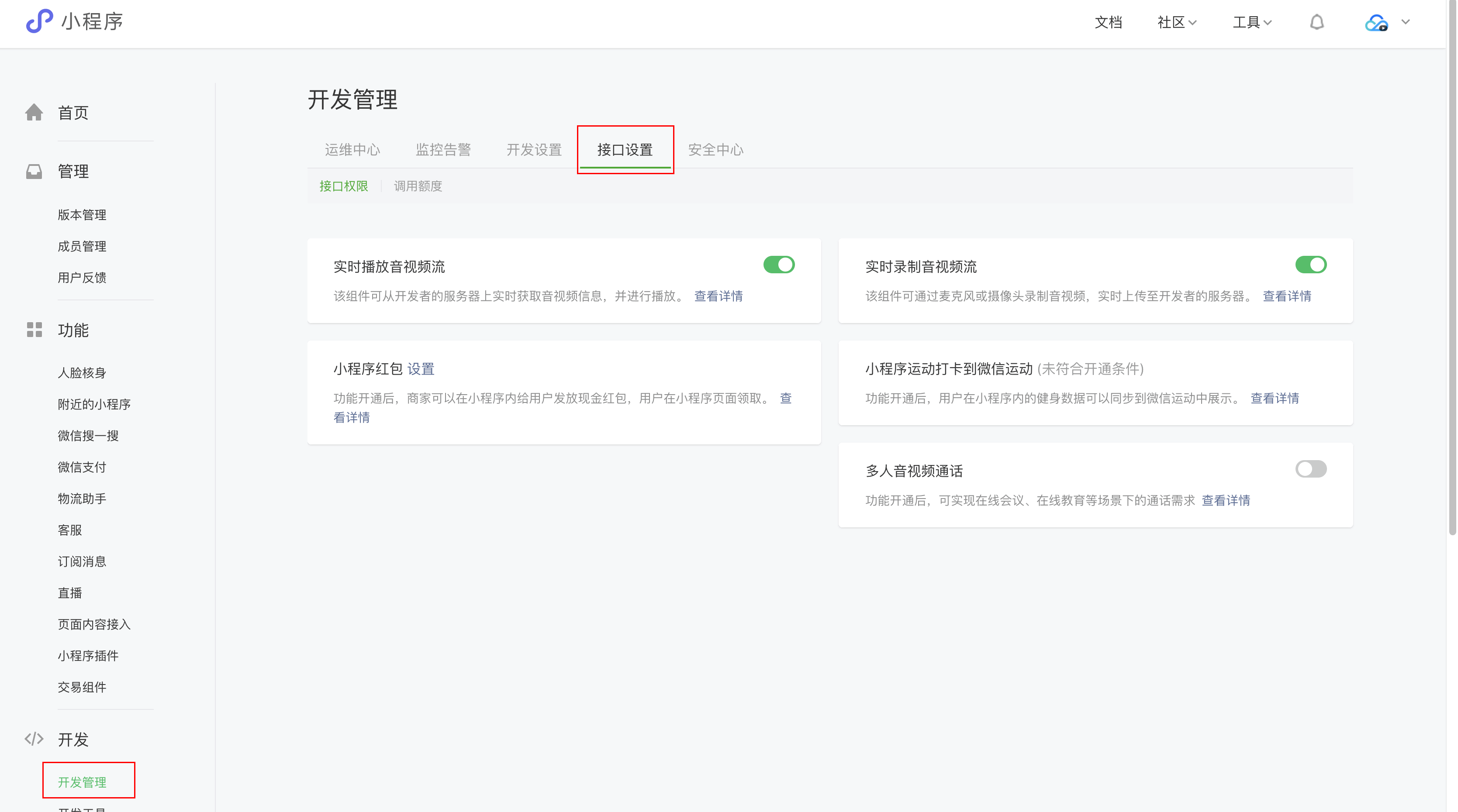 符合类目要求的小程序,需要在 微信公众平台 > 开发 > 开发管理 > 接口设置中自助开通该组件权限,如下图所示: