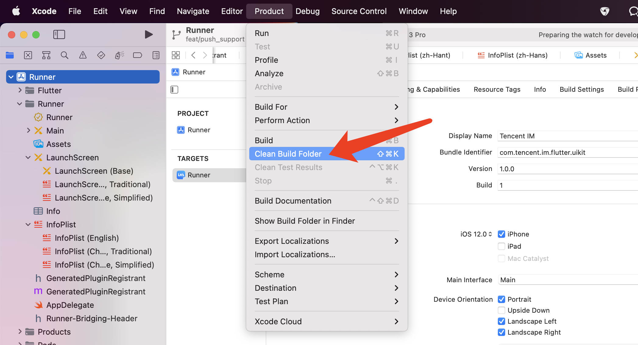 尝试方案一:配置运行后,如果报错,可以单击 Product > Clean Build Folder,清除产物后重新 pod install 或 flutter run