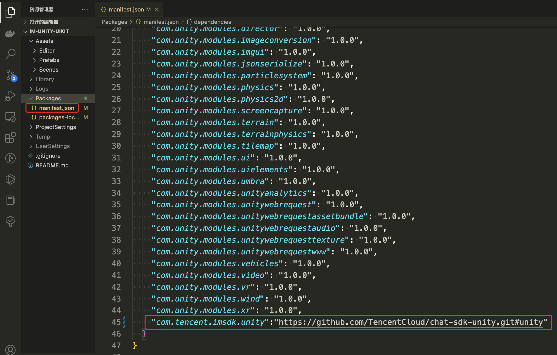 3. 根据目录,找到 Packages/manifest.json,并修改依赖如下: