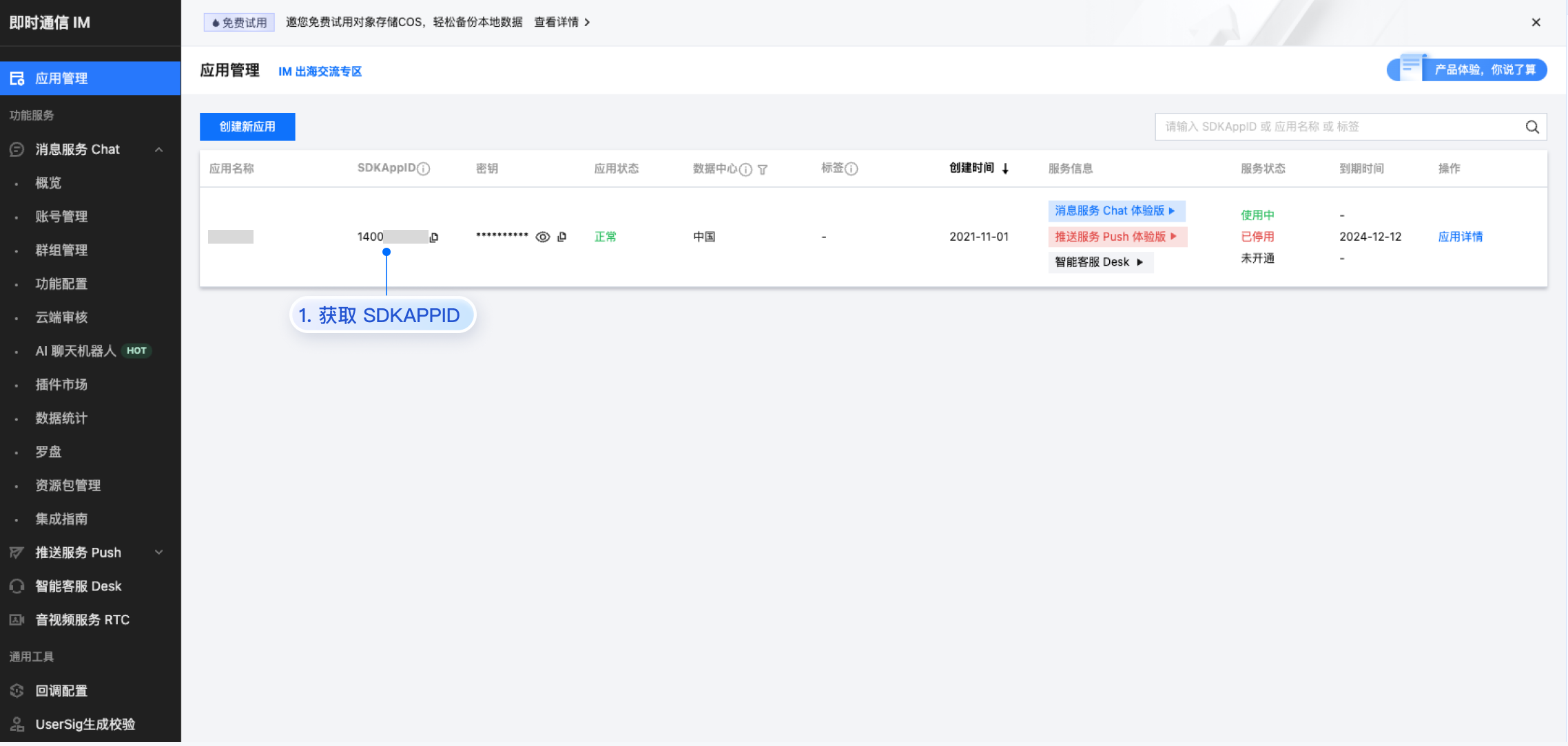 SDKAppID:在 即时通信 IM 控制台 > 应用管理 单击创建新应用,获取 SDKAppID。