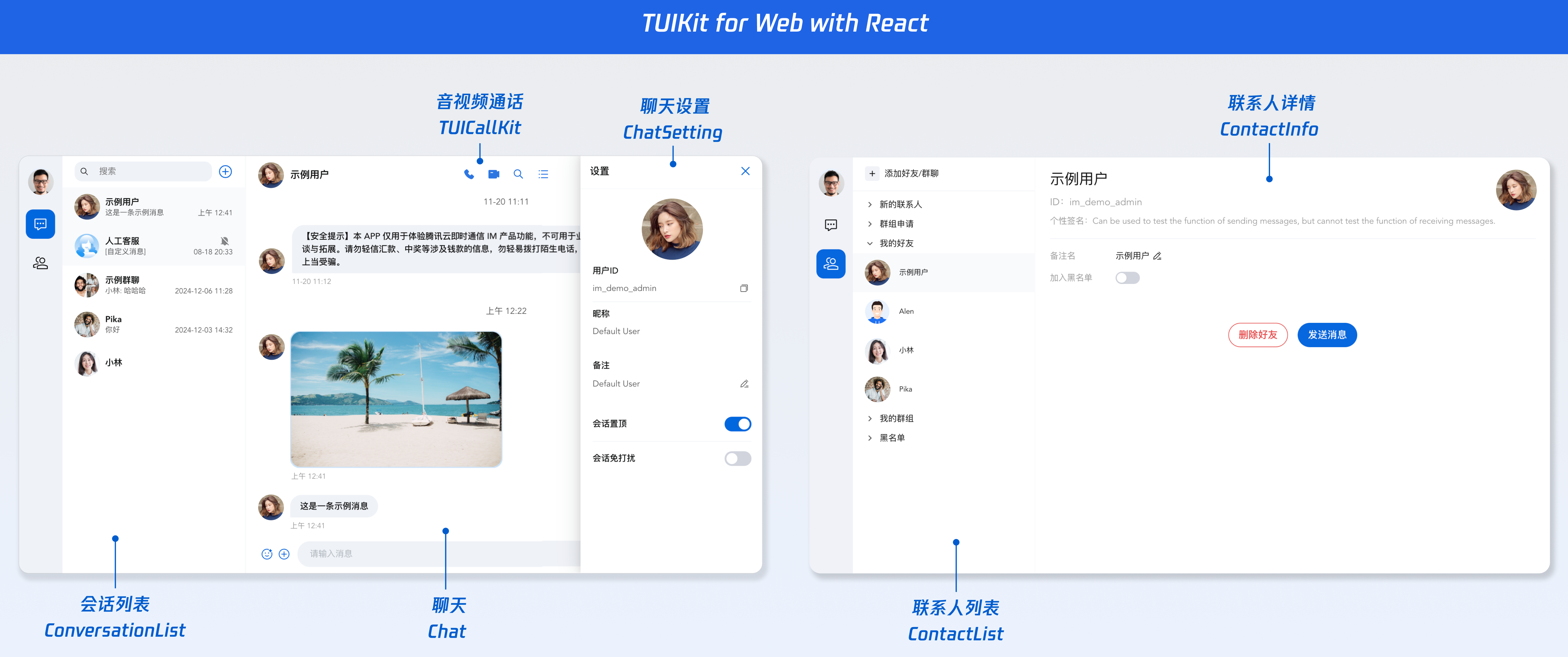 chat-uikit-react 主要分为 ConversationList、Chat、MessageList、ChatHeader、MessageInput、ChatSetting、Search、Contact 等核心 UI 组件,每个 UI 组件负责展示不同的内容。