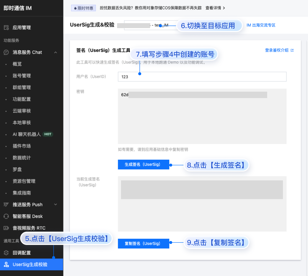 userSig:单击 即时通信 IM 控制台 > 开发工具 > UserSig生成校验,切换至目标应用所在账号,填写创建的 userID,即可生成 userSig。
