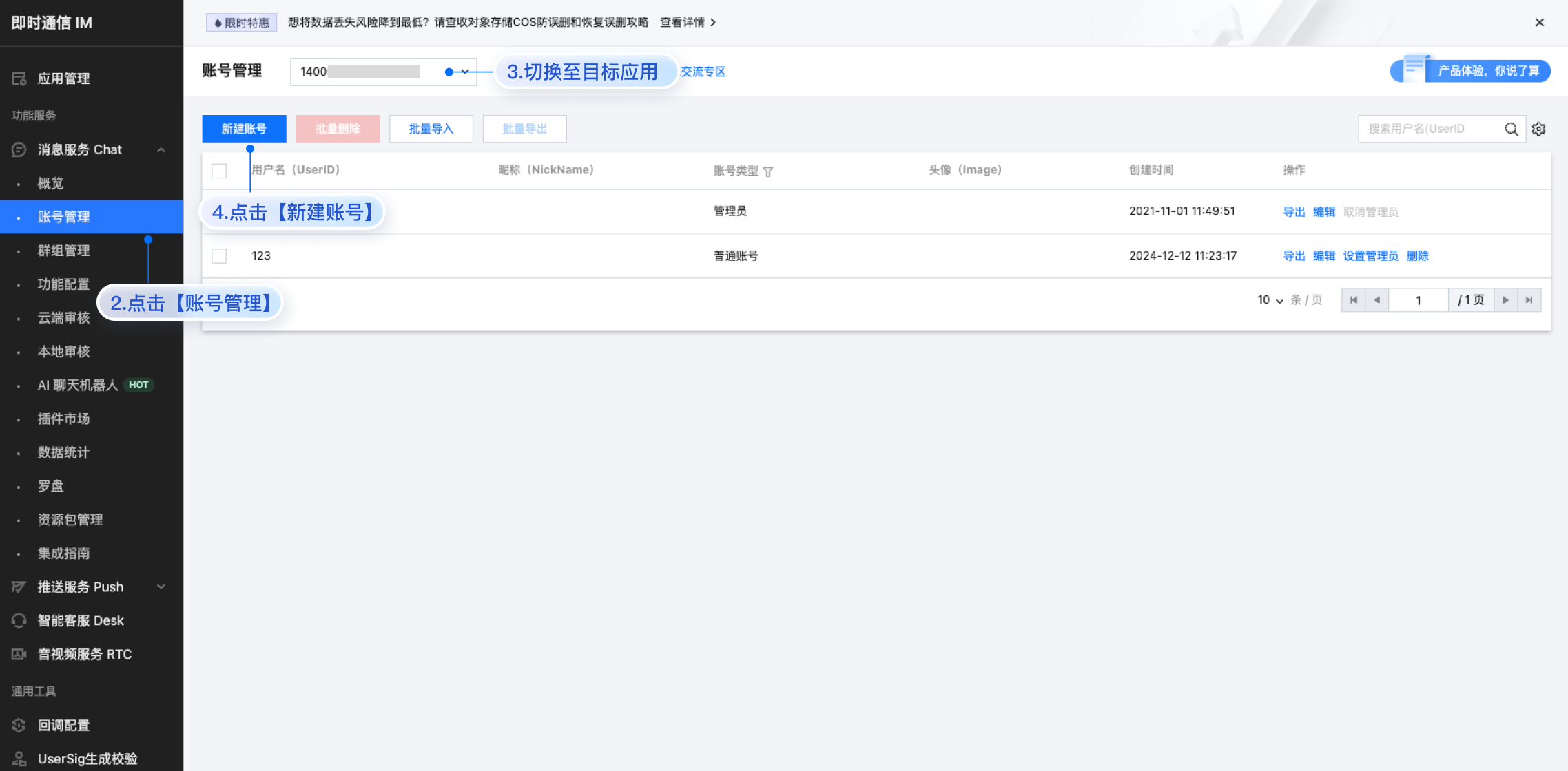 userID:单击 即时通信 IM 控制台 > 消息服务 Chat > 账号管理,切换至目标应用所在账号,您可以创建 2~3 个账号用于体验单聊、群聊的功能。