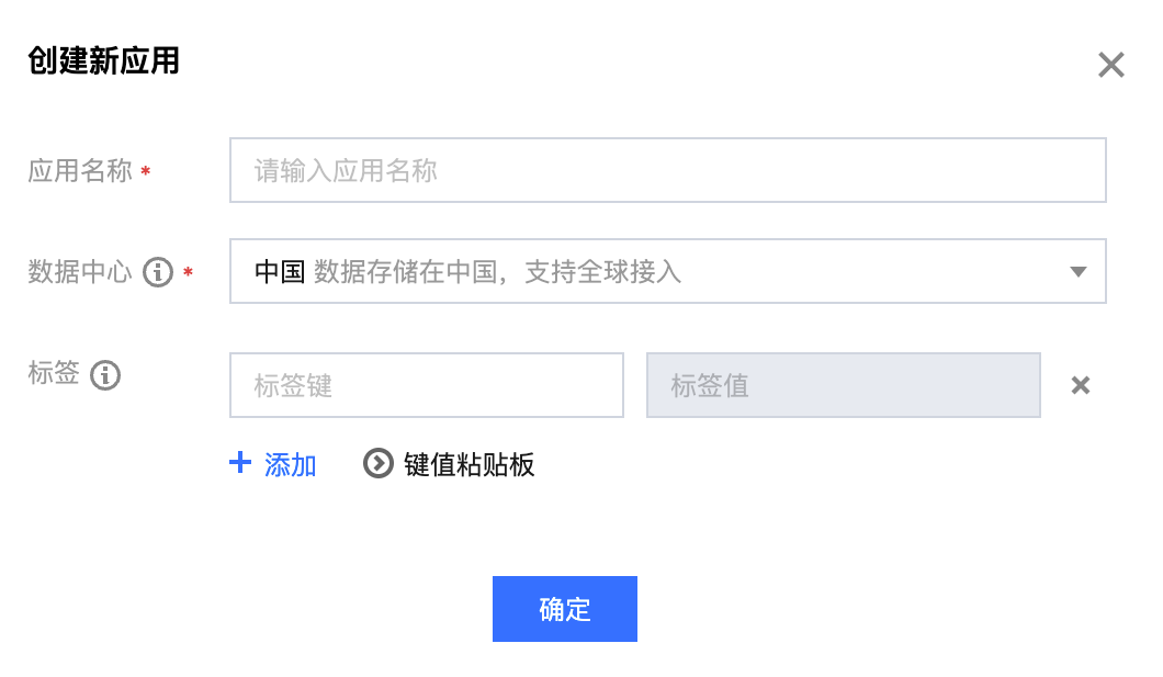 4. 单击创建新应用,在创建应用对话框中输入您的应用名称,单击确定。