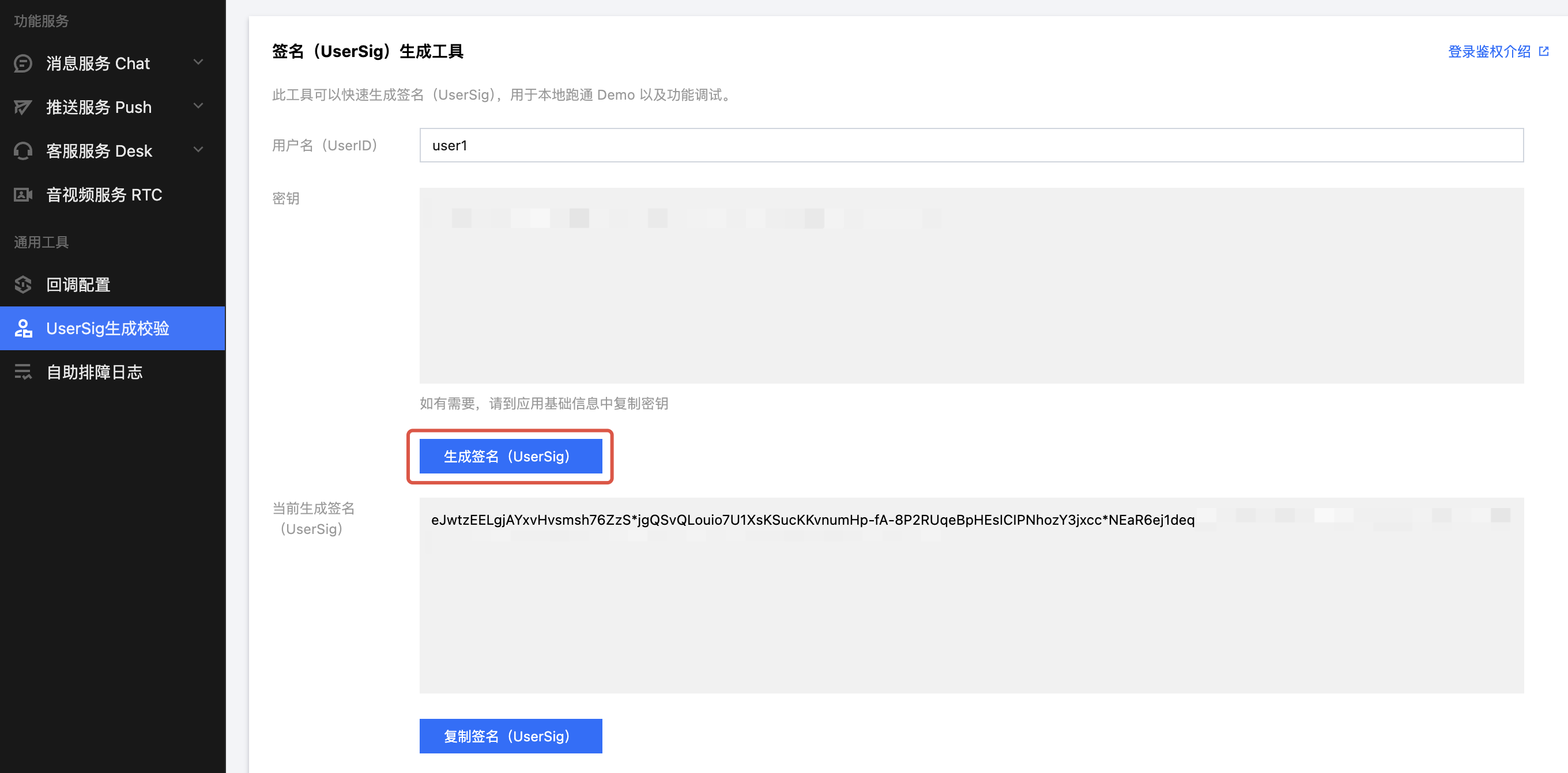 5. 单击创建后的应用,左侧导航栏单击 UserSig 生成&校验,创建一个 UserID 及其对应的 UserSig,复制签名信息,后续登录使用。