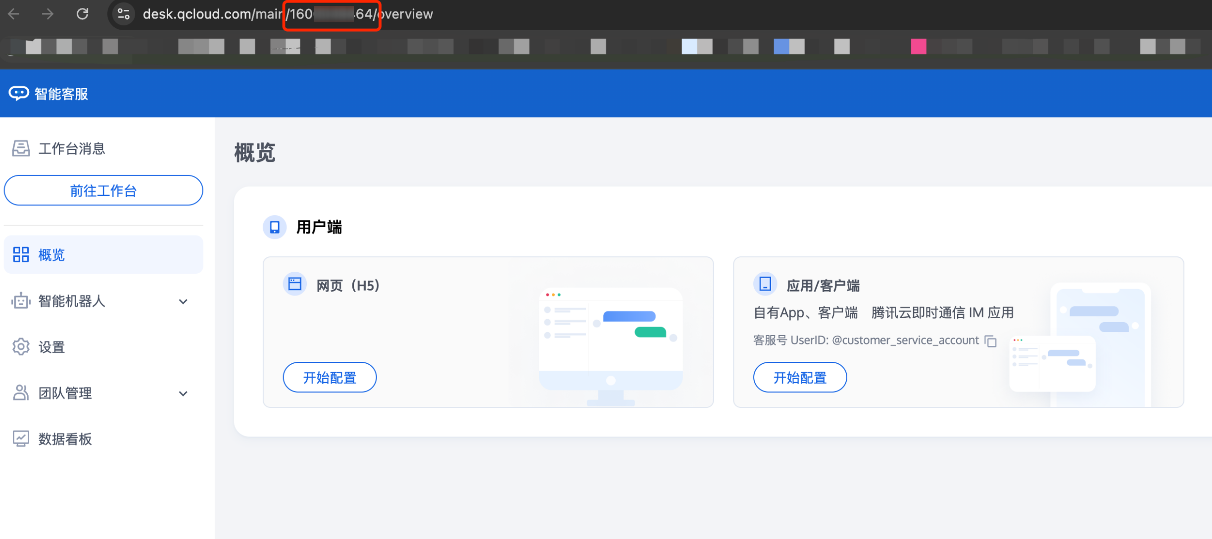 3. 在跳转过去的页面 URL 上,可以找到160开头的数字,这串数字就是智能客服应用的 SdkAppId。