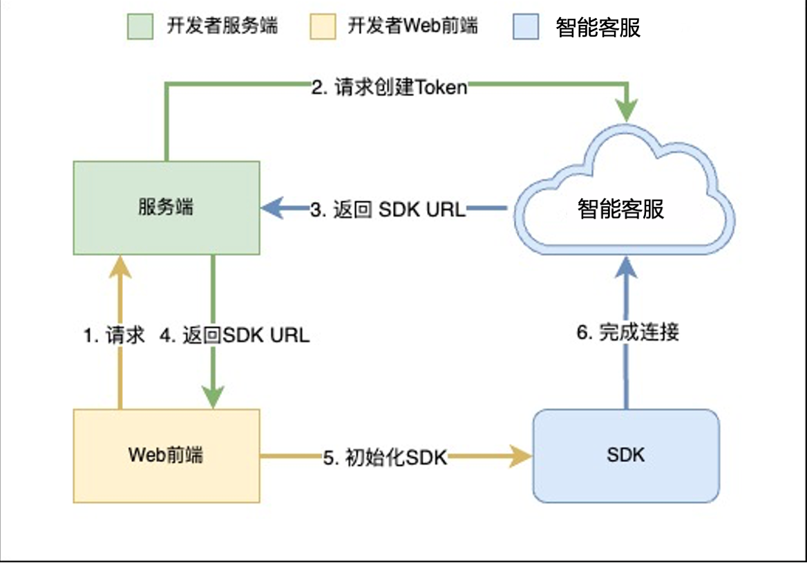 智能客服提供 JavaScript SDK 给开发者,开发者将 SDK 以 script 方式引入到页面中,即完成 SDK 的初始化,集成交互图如下:
