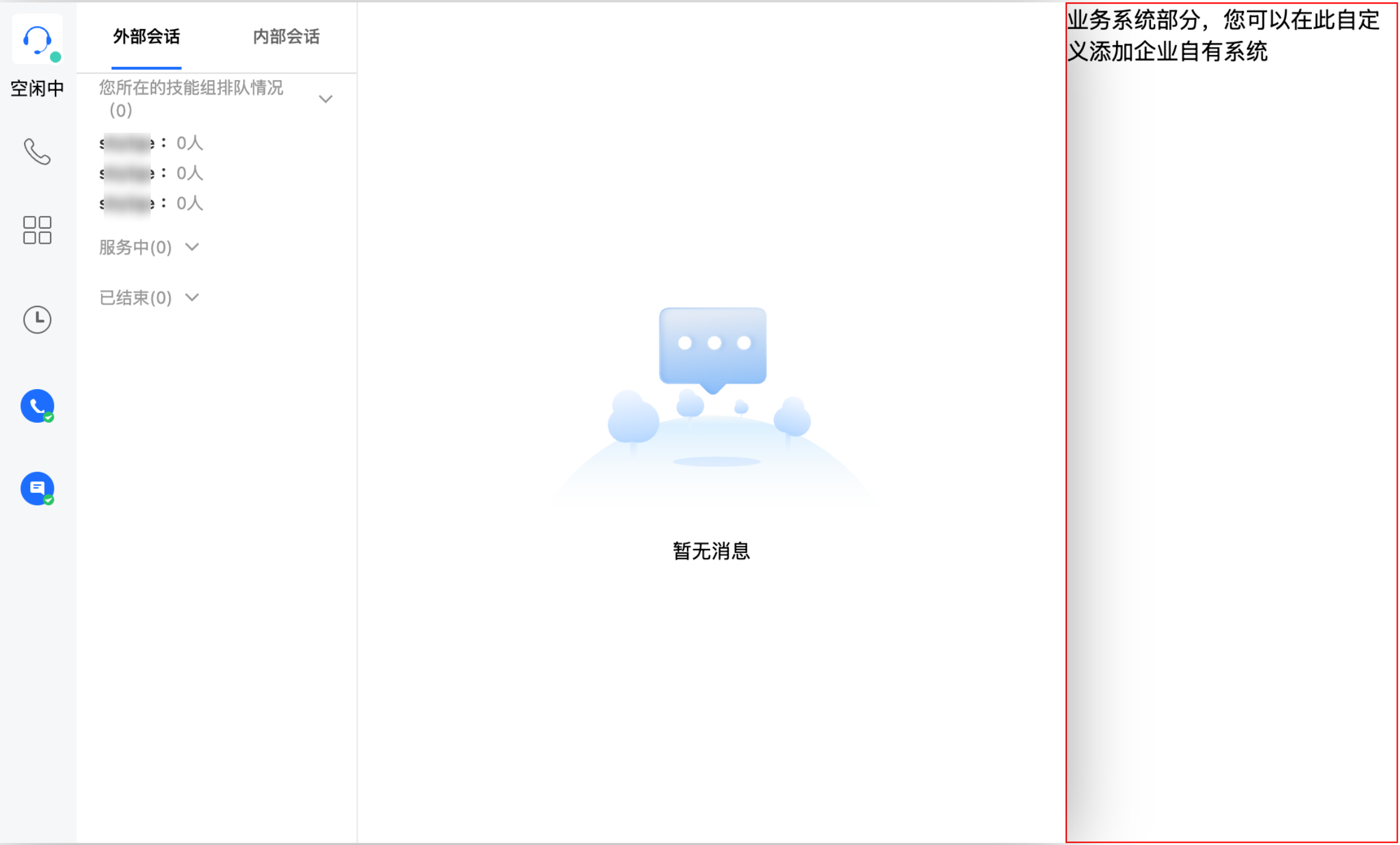 function injectTcccWebSDK(SdkURL) {if (window.tccc) {console.warn('已经初始化SDK了,请确认是否重复执行初始化');return;}return new Promise((resolve, reject) => {const script = document.createElement('script');script.setAttribute('crossorigin', 'anonymous');// 需要渲染进的 DomId// 为保证工作台 UI 完整,渲染的 Dom 最小高度为480px,最小宽度为760px// script.dataset.renderDomId = "renderDom";script.src = SdkURL;document.body.appendChild(script);script.addEventListener('load', () => {// 加载JS SDK文件成功,此时可使用全局变量"tccc"window.tccc.on(window.tccc.events.ready, () => {/*** TCCC SDK 初始化成功,此时可调用外呼、监听呼入事件等功能。* 注意⚠️:请确保只初始化一次SDK* */resolve('初始化成功')});window.tccc.on(window.tccc.events.tokenExpired, ({message}) => {console.error('初始化失败', message)reject(message)})})})}// 请求第二步实现的接口 /loginTCCC// 注意⚠️:以下仅为代码样例,不建议直接运行fetch('/loginTCCC').then(res => res.json()).then((res) => {const SdkURL = res.SdkURL; // 请确保SdkURL都是通过请求返回的,否则可能会出现不可预知的错误!return injectTcccWebSdk(SdkURL);}).catch((error) => {// 初始化失败console.error(error);})