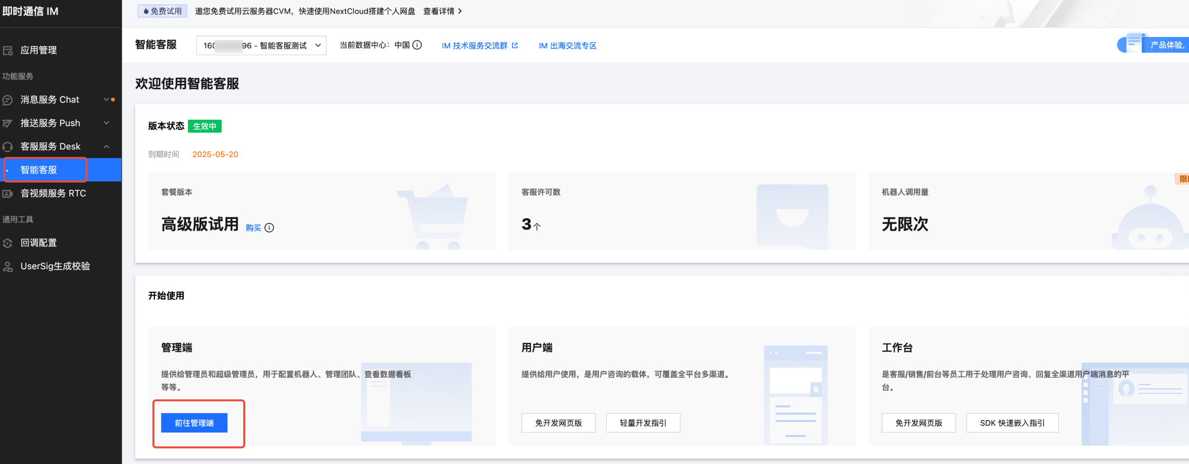 ,可参见 获取密钥。2. 获取智能客服应用的 SdkAppId,在 控制台智能客服页面,单击前往管理端。