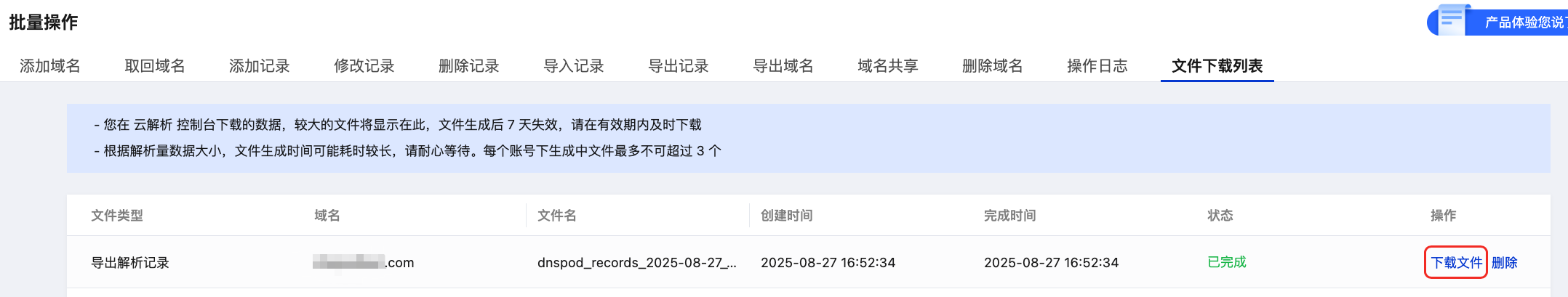 4. 在文件下载列表中单击下载文件,即可成功导出解析记录文件。如下图所示: