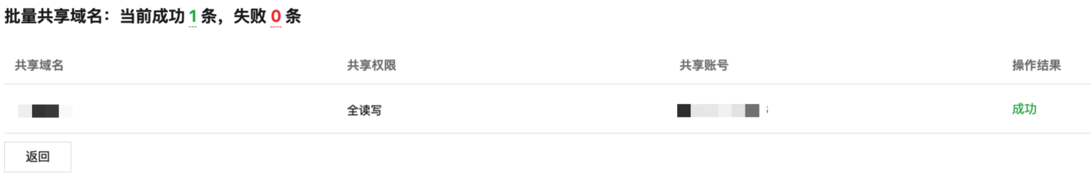 4. 完成域名共享操作后,自动跳转到操作结果页面,您可查看您的操作结果,如下图所示: