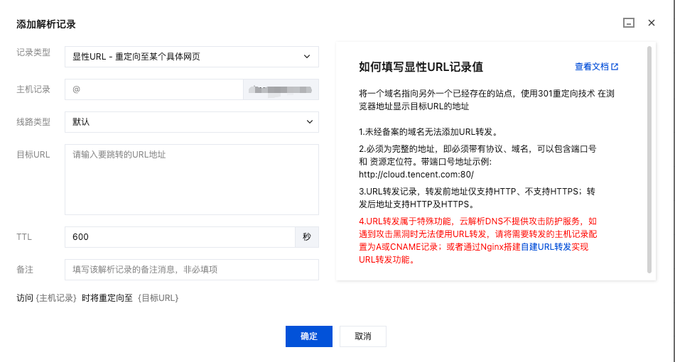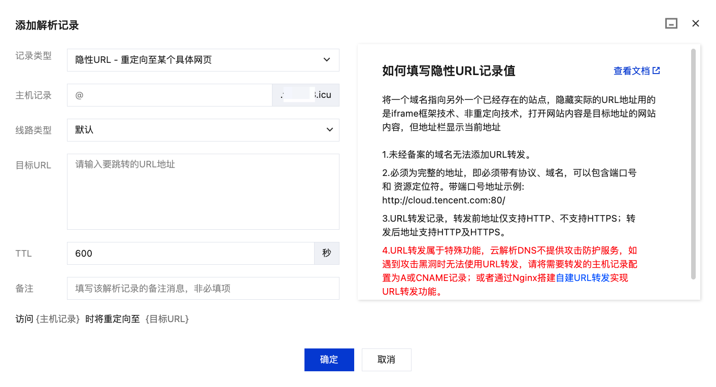 添加 URL 转发记录时,转发后域名需在工信部完成备案(任意接入商)。