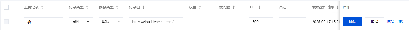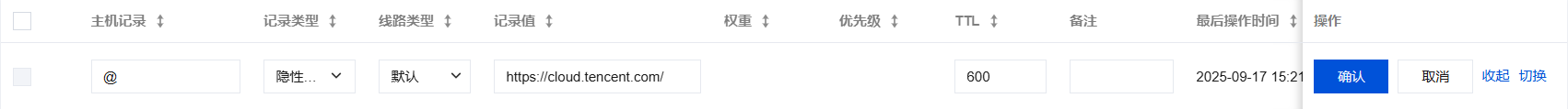 云解析 DNS 控制台目前支持行内模式和弹窗模式编辑解析记录,您可在编辑解析记录时,通过单击操作栏的切换进行模式切换。