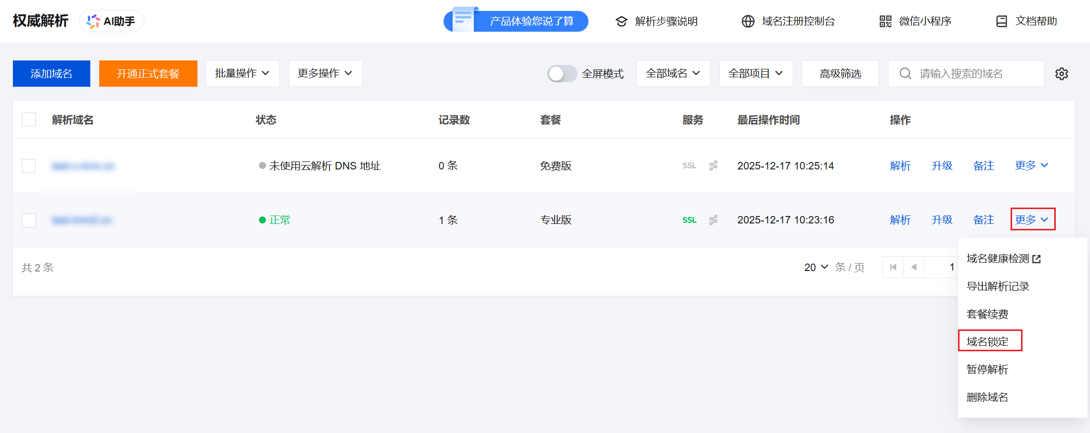 2. 在权威解析中,选择待锁定域名解析的域名行,单击更多,选择域名锁定。如下图所示:
