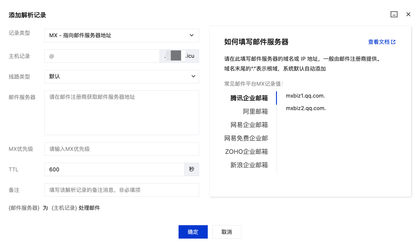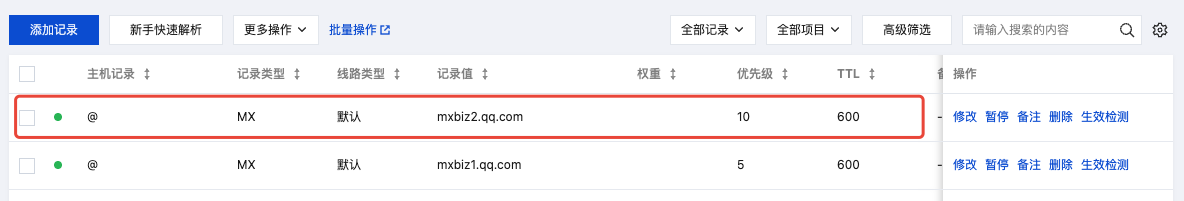 如果需要设置邮箱,让邮箱能收到邮件,就需要添加 MX 记录。本文档指导您如何添加 MX 记录。