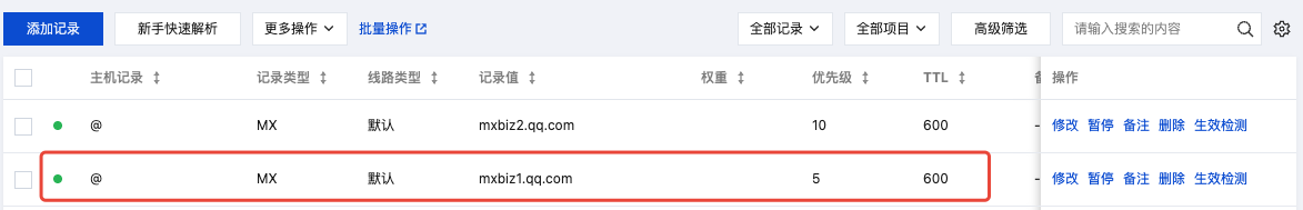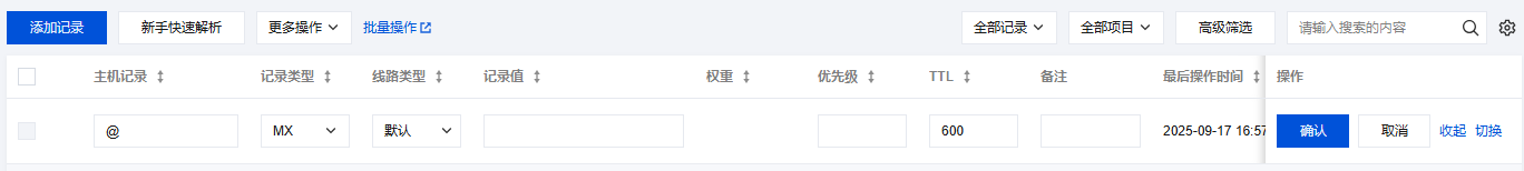 线路类型:选择 “默认” 类型,否则会导致部分用户无法解析,邮件无法收取;MX 一般不需要做智能解析,直接默认即可。