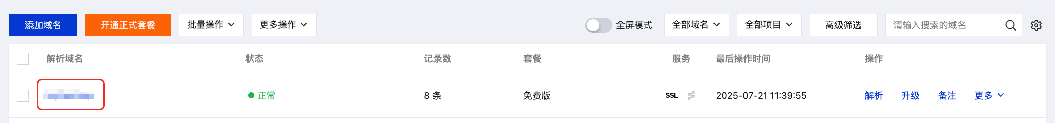 2. 在权威解析页面中,单击目标域名,进入该域名的记录管理页面,如下图所示: