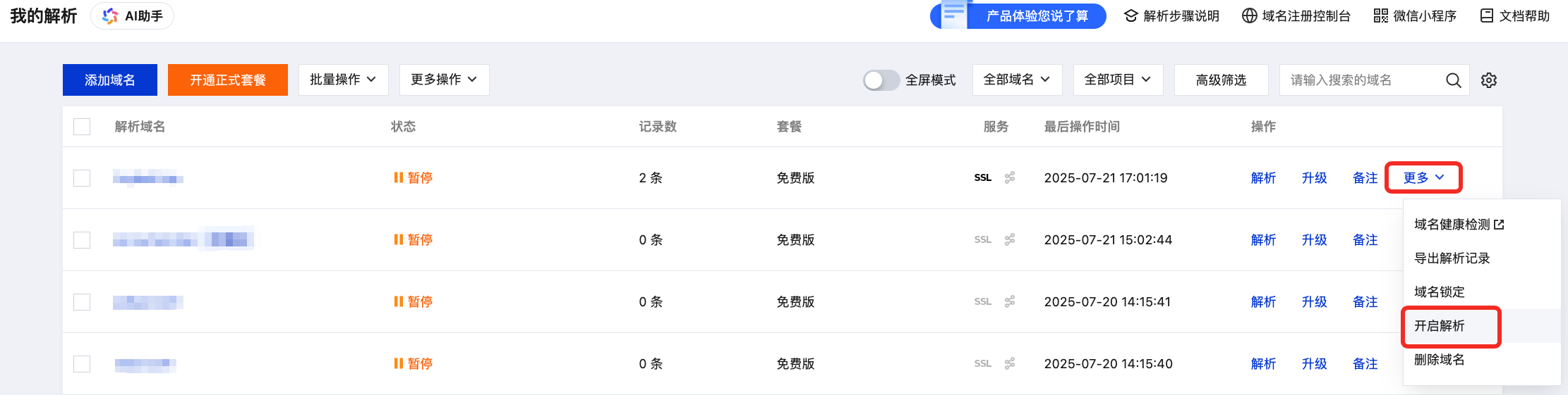 3. 当您需要恢复使用时,请单击操作栏的更多 > 开启解析。如下图所示: