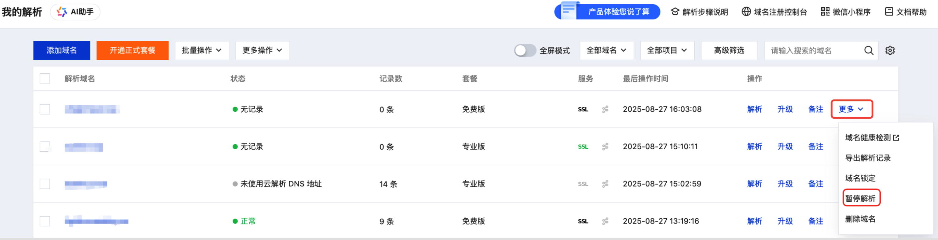 2. 在我的解析页面中,选择需要进行暂停记录的域名,单击操作栏的更多 > 暂停解析。如下图所示: