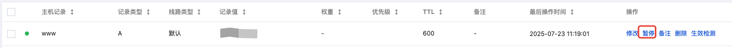 3. 选择您需要暂停的解析记录,并单击操作栏的暂停。如下图所示: