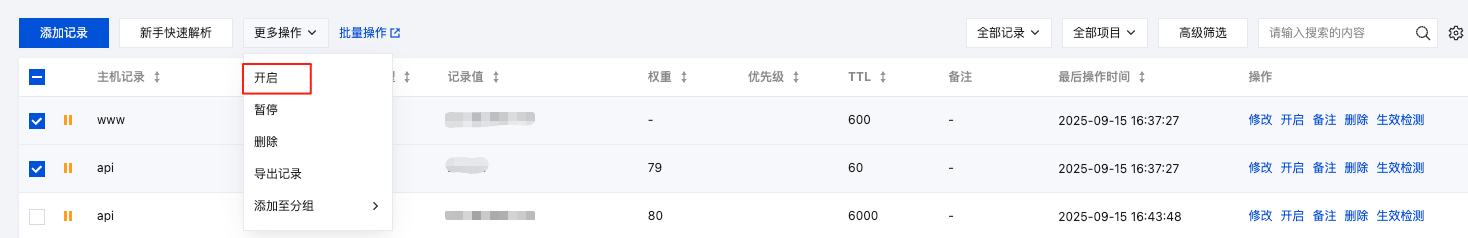 若您需要开启多个解析记录,请先勾选已暂停的解析记录,并单击上方的更多操作 > 开启,即可恢复解析。