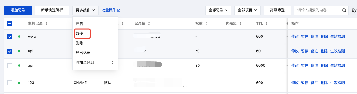 若您需要暂停多个解析记录,请先勾选解析记录,并单击上方的更多操作 > 暂停,即可暂停解析。