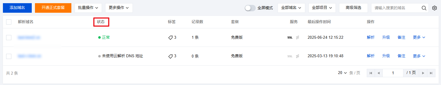 2. 在我的解析页面中的域名解析列表,可查看解析状态,包含以下5种常见状态: