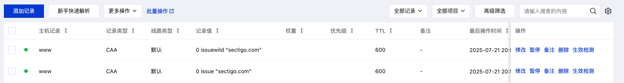0 issue "sectigo.com" 与 0 issuewild "sectigo.com"。权重:不填写,可忽略。