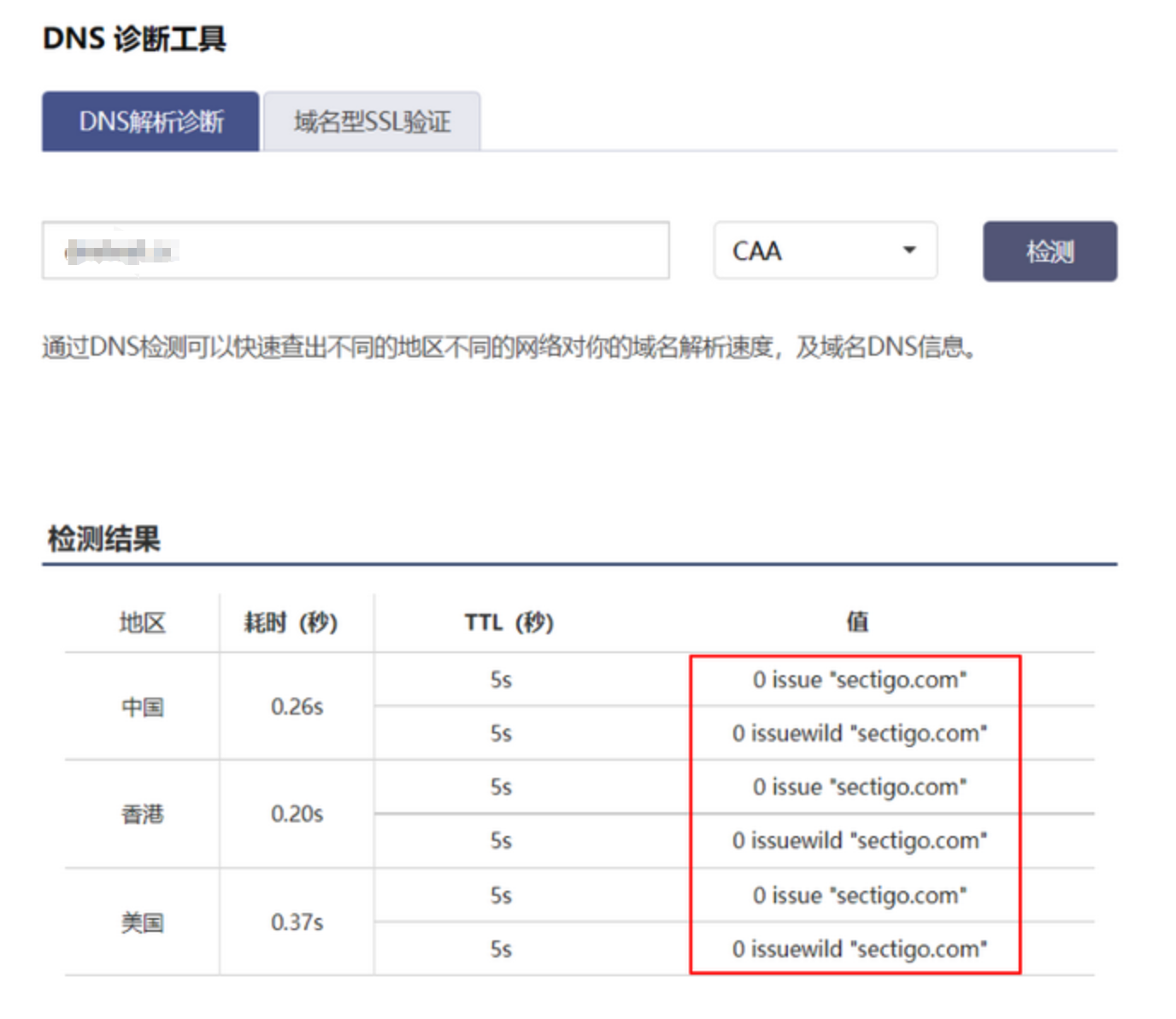 前往 DNS 诊断工具,输入域名名称并选择 CAA 记录后单击检测,返回值为空或包含