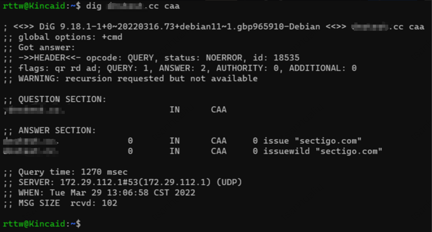 0 issuewild "sectigo.com" 和 0 issue "sectigo.com" 即为正常。如下图所示: