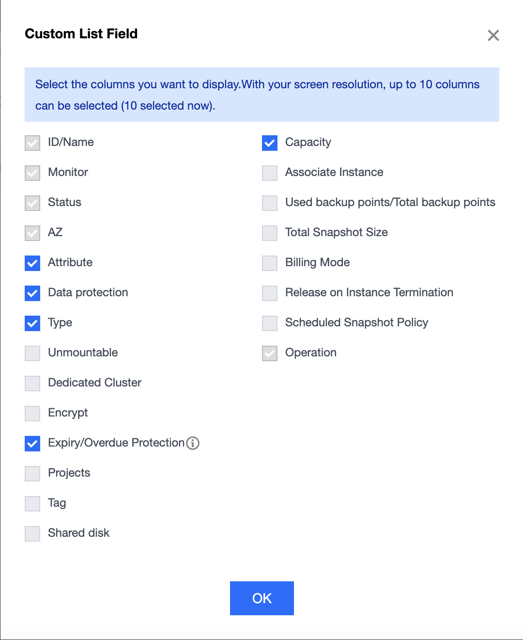 2. In the "Customize List Fields" pop-up window, check Expiry/Overdue Protection and click Confirm, as shown below: