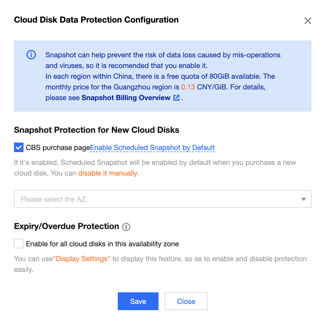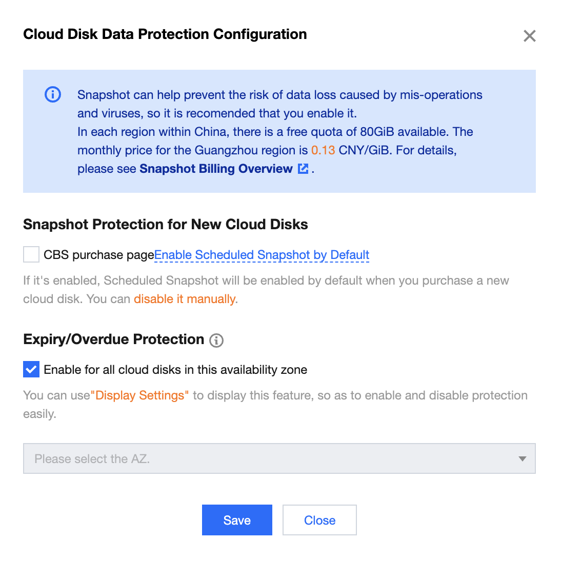 2. In the pop-up Cloud Disk Data Protection Configuration window, check Snapshot Protection for New Cloud Disks and select the available zone from the drop-down list, as shown below: