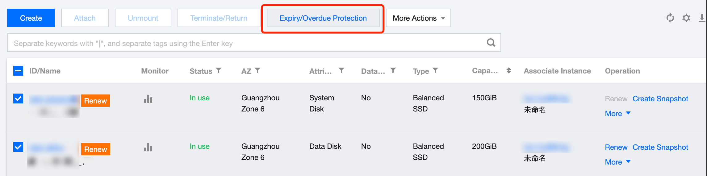 1. After selecting a cloud disk on the Cloud Disk List page, choose Expiry/Overdue Protection at the top of the list, as shown below: