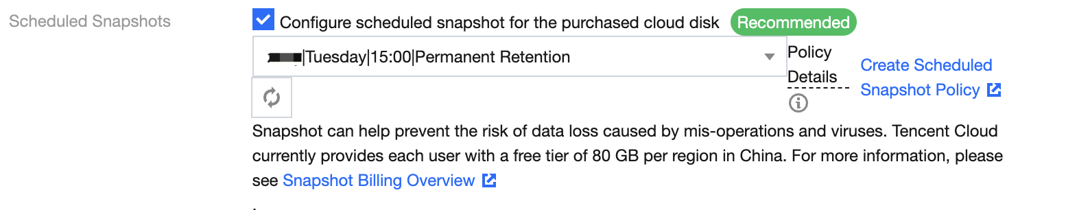 When creating a cloud disk in the selected availability zone, Scheduled Snapshot will be selected by default, meaning a scheduled snapshot policy will be associated. You can deselect Scheduled Snapshot as needed.