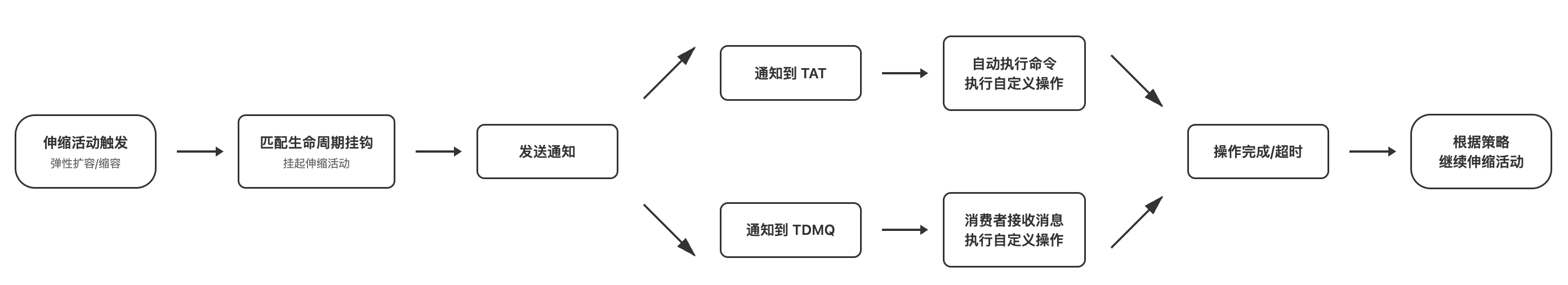伸缩组创建生命周期挂钩后,当关联的伸缩活动(如扩容或缩容)发生时,该活动会进入“挂起”状态。此时,生命周期挂钩会通过您指定的通知方式(如 TAT 命令 或 TDMQ 消息)来触发您的自定义操作。生命周期挂钩超时时,该挂起会终止。