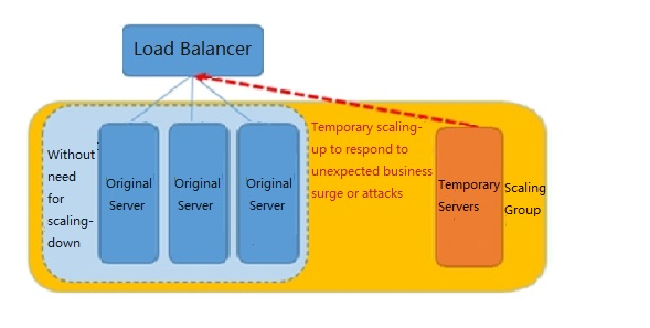 For instance, you have an e-commerce website application currently utilizing five instances. If you are conducting a marketing campaign and are concerned that the traffic will far exceed your estimates, you can set up your system to launch two additional instances when the load on the current instances rises to 70%, and then terminate the surplus instances when the load drops to 40%. You can configure two simple policies for the scaling group, one for expansion when the load exceeds 70%, and another for contraction when the load falls below 40%. As illustrated in the following diagram: