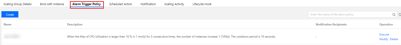 3. On the details page of the scaling group, select the Alarm Trigger Policy tab. On this page, manage the alarm trigger policies associated with the scaling group, as depicted in the figure below: