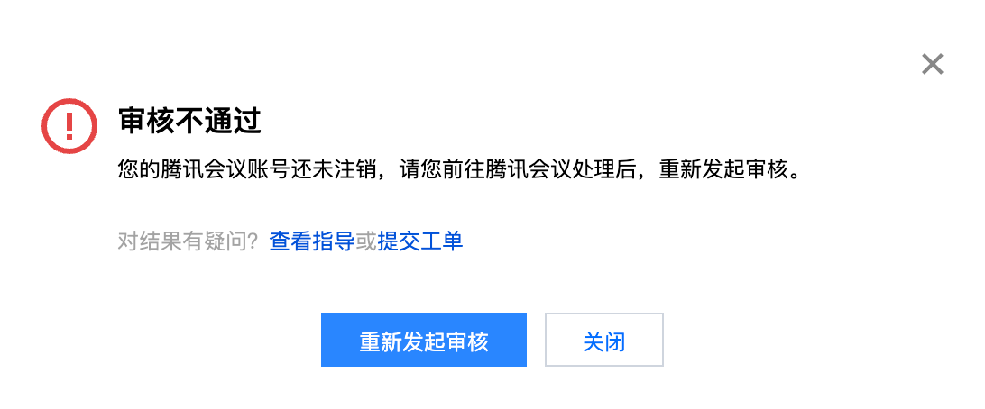 审核不通过:单击审核不通过,提示框会展示不通过原因,请按照指引处理,若您确认已按要求处理,可提交重新发起审核,每天最多可提交3次审核。若对审核结果有疑问,请提交工单。