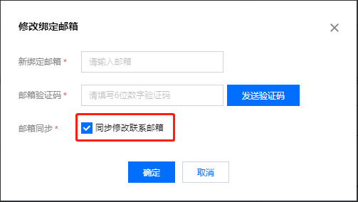 4. 根据页面提示,输入新绑定邮箱和验证码,单击确定,完成修改。