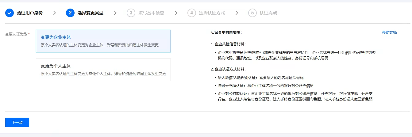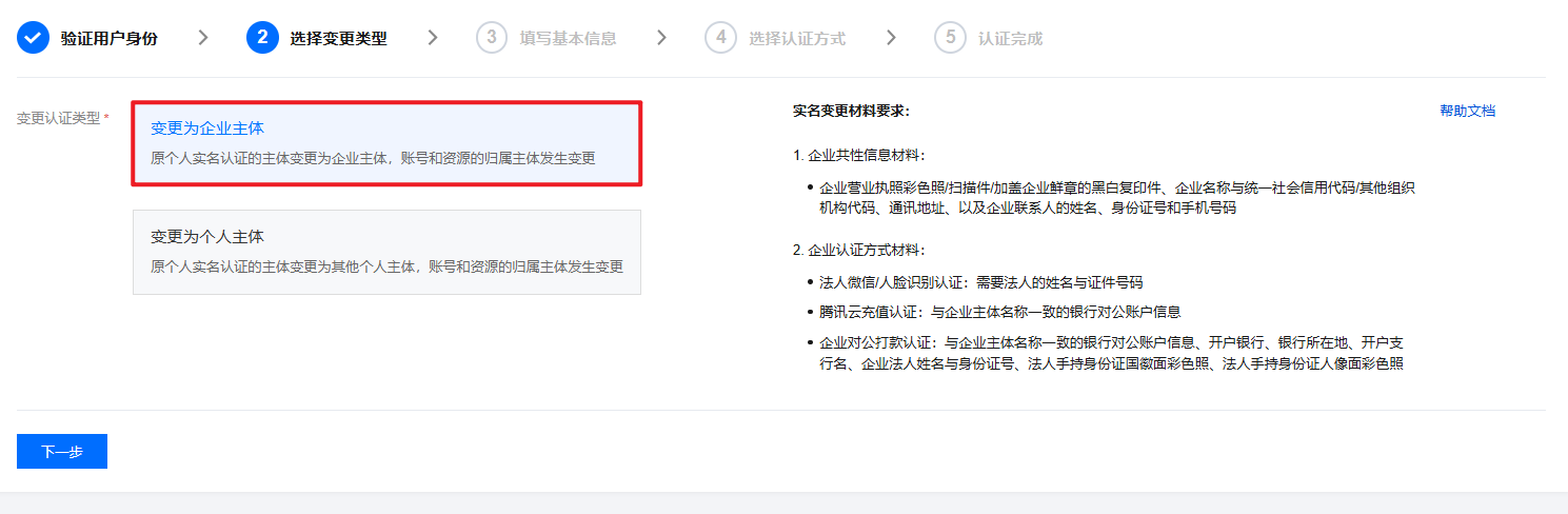 5. 在选择变更类型页面,选择变更为企业主体,单击下一步。
