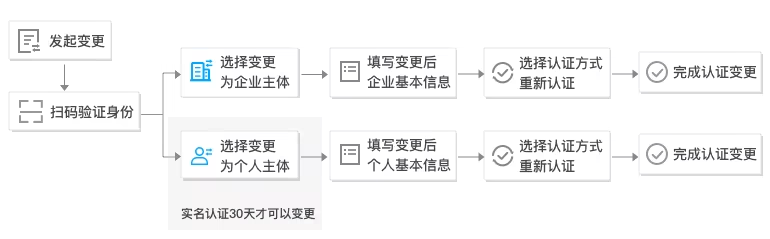实名认证变更开始到审批通过/驳回期间,您可以随时撤销变更申请,实名认证信息将恢复为原实名认证主体。