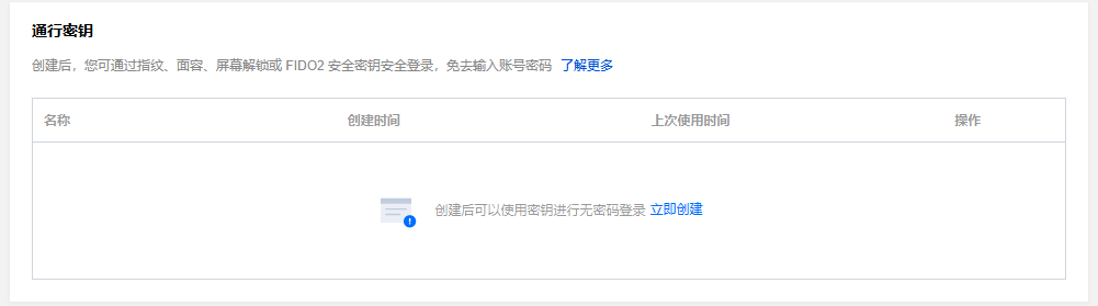 若您已经创建过通行密钥,则在通行密钥模块,单击创建通行密钥。