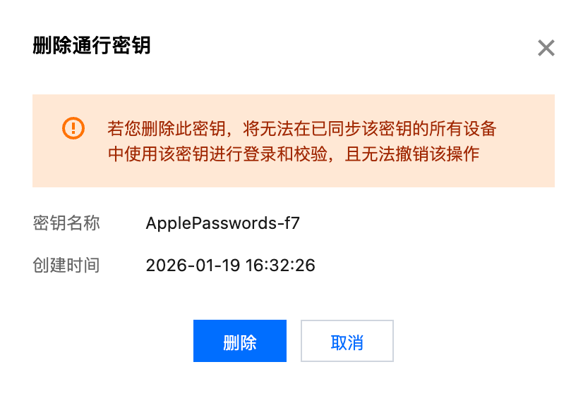若您删除此密钥,将无法在已同步该密钥的所有设备中使用该密钥进行登录和校验,且无法撤销该操作。