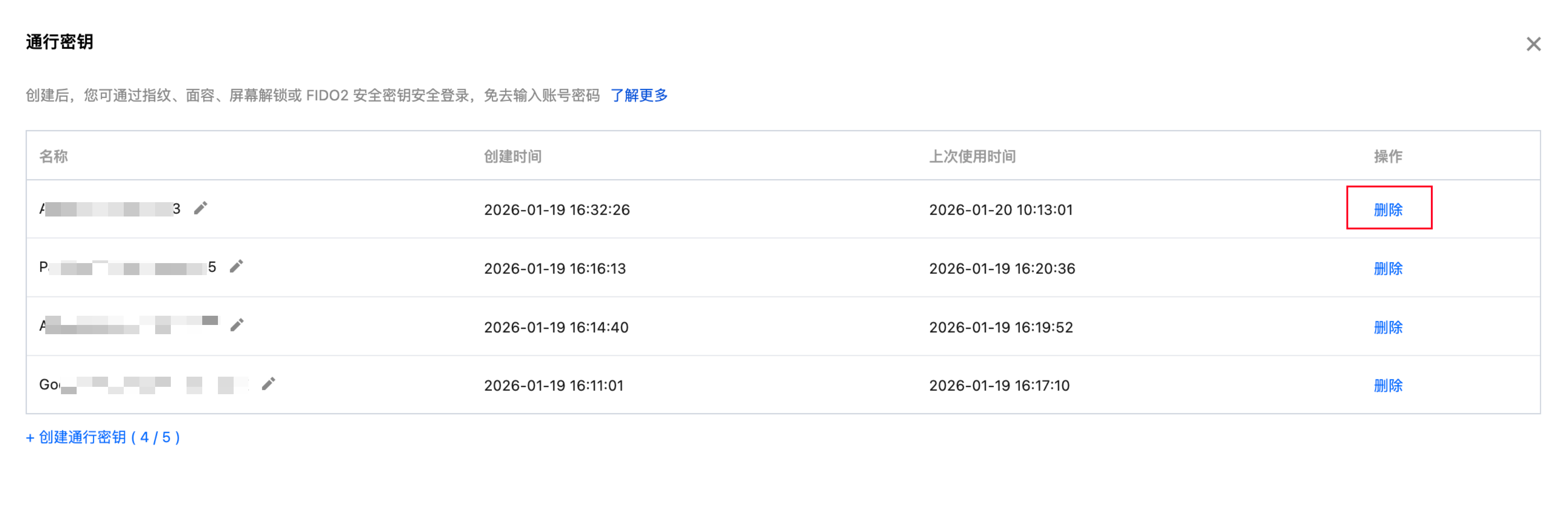 2. 在通行密钥模块,选择需要删除的通行密钥,单击删除。