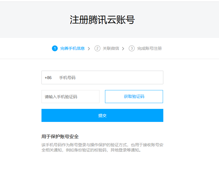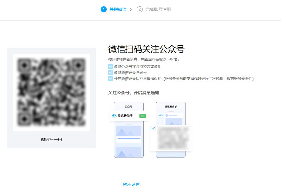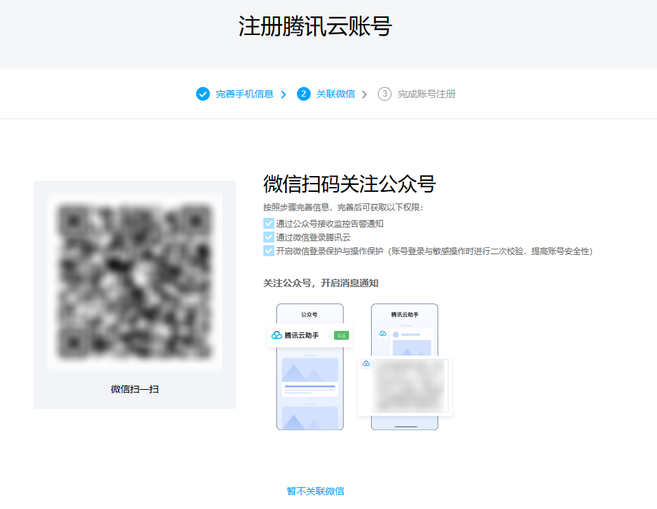 打开微信扫一扫,扫描页面的二维码,关联腾讯云账号,即完成注册。