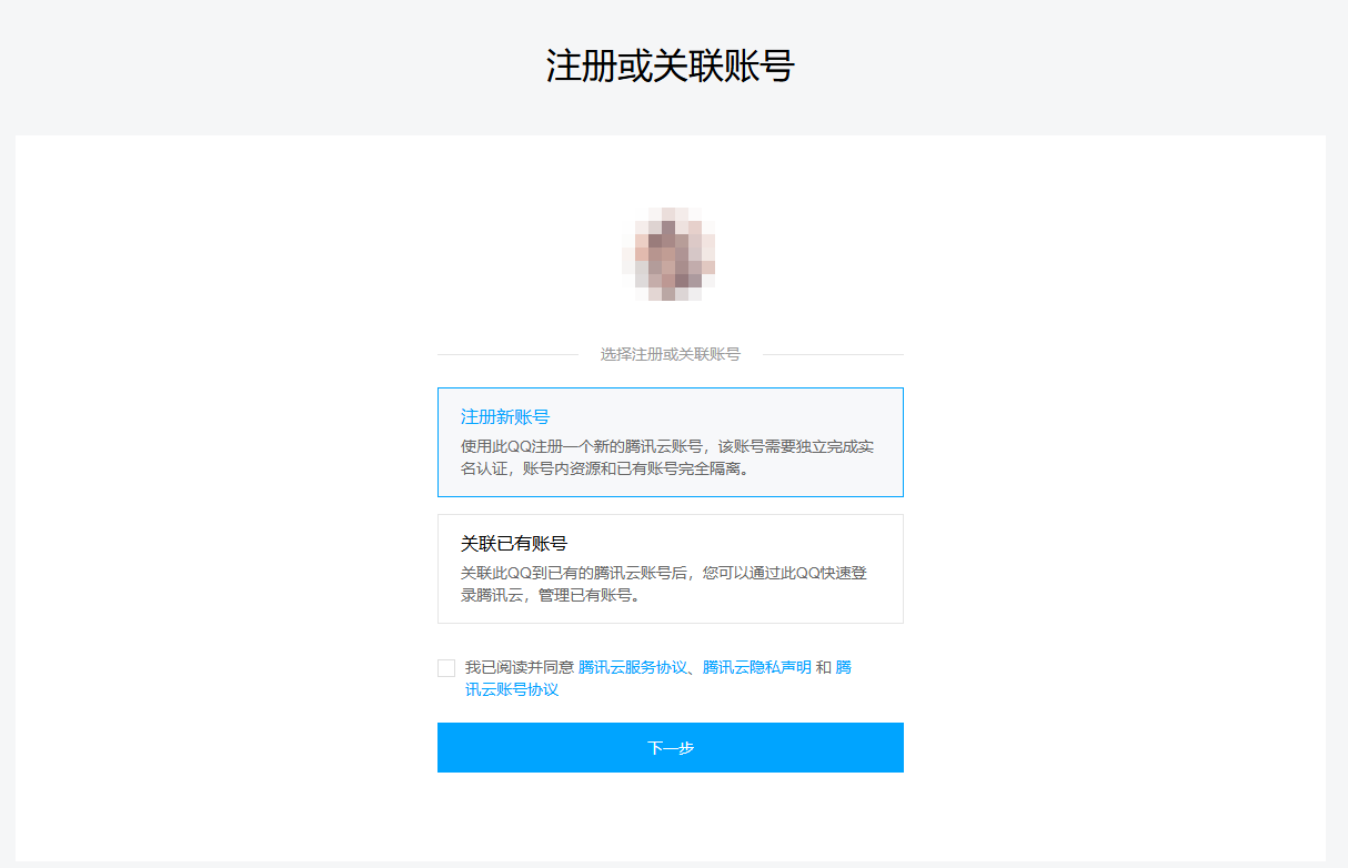 3. 待电脑端的页面跳转到注册或关联账号后,选择注册新账号,勾选我已阅读并同意腾讯云服务协议、腾讯云隐私声明和腾讯云账号协议,单击下一步