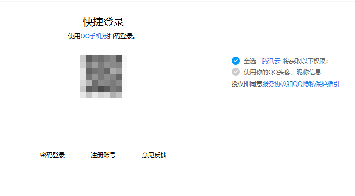 2. 打开手机 QQ 扫一扫,扫描页面二维码,单击QQ授权并登录。 您也可以单击页面二维码下方的密码登录,输入 QQ 账号和密码,单击授权并登录