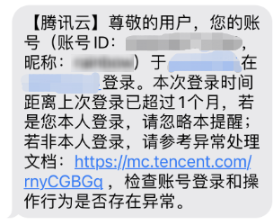 用户手机收到来自腾讯云发送的登录时间间隔超过一个月的短信提醒: